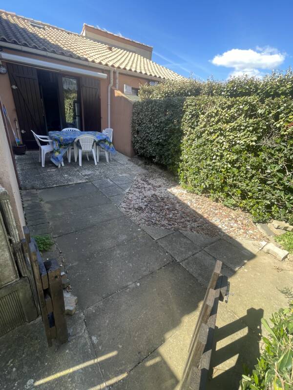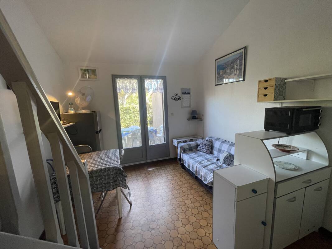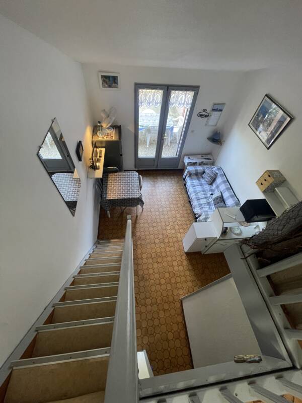 Ce pavillon composé d’un jardinet avec terrasse / store banne, dans une coin tranquille, offre un pièce à vivre avec kitchenette (four, micro-ondes plaques de cuisson), un coin nuit au rdc avec un lit en 90 + étagères, une salle d’eau avec toilette, mezzanine un lit en 140 avec rangements.
