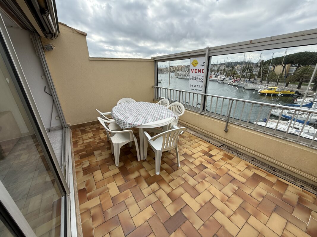 Grande pièce a vivre avec coin cuisine, ouvert sur une belle et agréable terrasse vue port, 1 cabine avec 2 lit superposé, 1 salle d’eau avec WC et un mezzanine vue sur le port avec rangement.