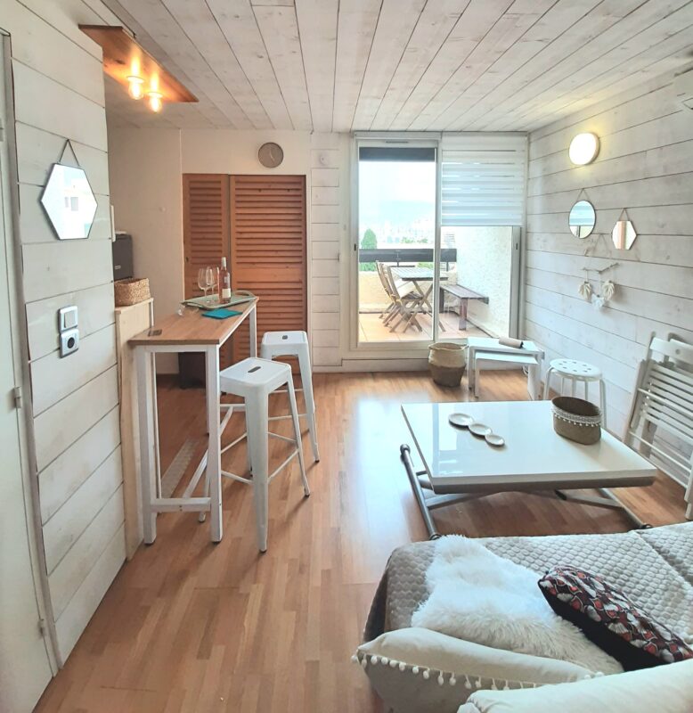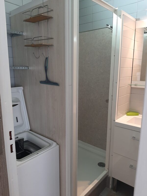 Il se compose d’un séjour avec cuisine équipée/aménagée, une chambre avec rangements, salle d’eau avec machine à laver, toilette.